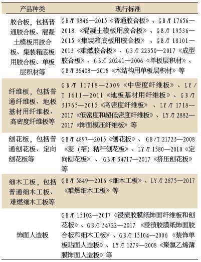 目前,我國人造板行業已基本形成了以國家標準為主體,以行業標準、地方標準、團體標準和企業標準補充配套的標準體系,并在相關領域形成了一批重要標準,為人造板行業發展提供了有力的技術支撐,表2為我國目前現行的主要人造板產品標準。