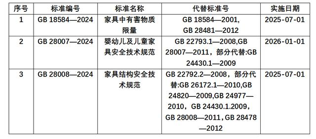 2024年6月25日國家標準化管理委員會批準18強制性國家標準,其中家具行業(yè)有3項,分別是《GB 18584-2024家具中有害物質(zhì)限量》將于2025年7月1日正式實施、《GB 28008-2024家具結(jié)構(gòu)安全技術(shù)規(guī)范》將于2025年7月1日正式實施、《GB 28007-2024嬰幼兒及兒童家具安全技術(shù)規(guī)范》將于2026年1月1日正式實施。