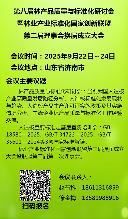 金秋送爽,泉韻悠揚。“第八屆林產(chǎn)品質(zhì)量與標準化研討會暨林業(yè)產(chǎn)業(yè)標準化國家創(chuàng)新聯(lián)盟第二屆理事會換屆成立大會”將于2025年9月22日~24日在山東濟南舉辦。