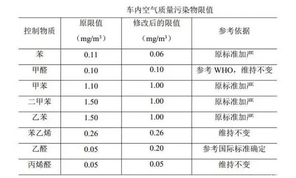 據了解,該標準是在2011年發布的《乘用車內空氣質量評價指南》基礎上重新修訂的,重新明確了乘用車內8種揮發性污染物的濃度限值,特別針對苯、甲苯等致癌物質提出了更嚴格的要求。其中苯的濃度限值由原來的0.11 mg/m?下調至0.06 mg/m?,降幅超過45%;甲苯限值由1.10 mg/m3調整為1.00mg/m?;二甲苯和乙苯的限值均由原來的1.50mg/mm?調整為1.00mg/立方米,降低到原來的2/3;甲醛、苯乙烯等物質則維持原標準不變。